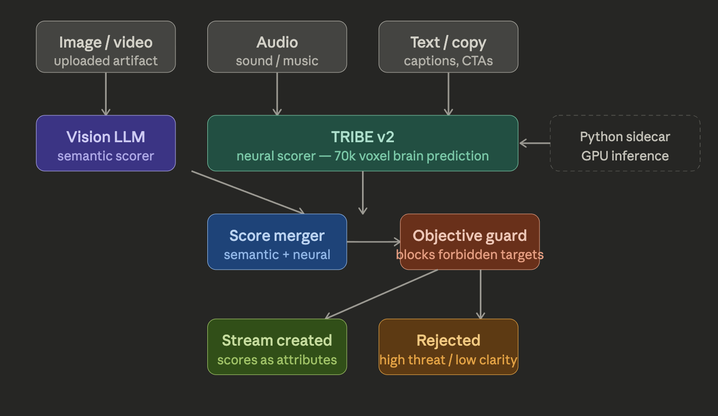 The diagram above shows the full pipeline. What’s new is the teal box — TRIBE v2 running as a Python sidecar (GPU inference, called over a local socket), with the resulting 70,000-voxel prediction mapped through a neuroscience atlas to produce named scores: